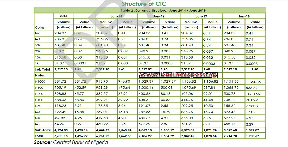 The report said the N1,000 and N500 banknotes remained dominant with shares of 60.7 percent and 28.1 percent, respectively, in value terms in the first half of 2018.